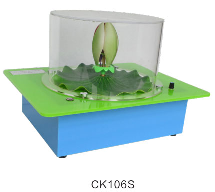 用于演示向心力和離心力。閉合的蓮花隨電機運動開始旋轉(zhuǎn),當速度逐漸增大時,彈簧的彈力不足以提供花瓣做圓周運動的向心力,花瓣開始做逐漸遠離圓心的運動即離心運動,表現(xiàn)為花瓣慢慢開放。不同的速度下花瓣張開的大小不同,當速度大到一定程度時,花瓣完成張開。
